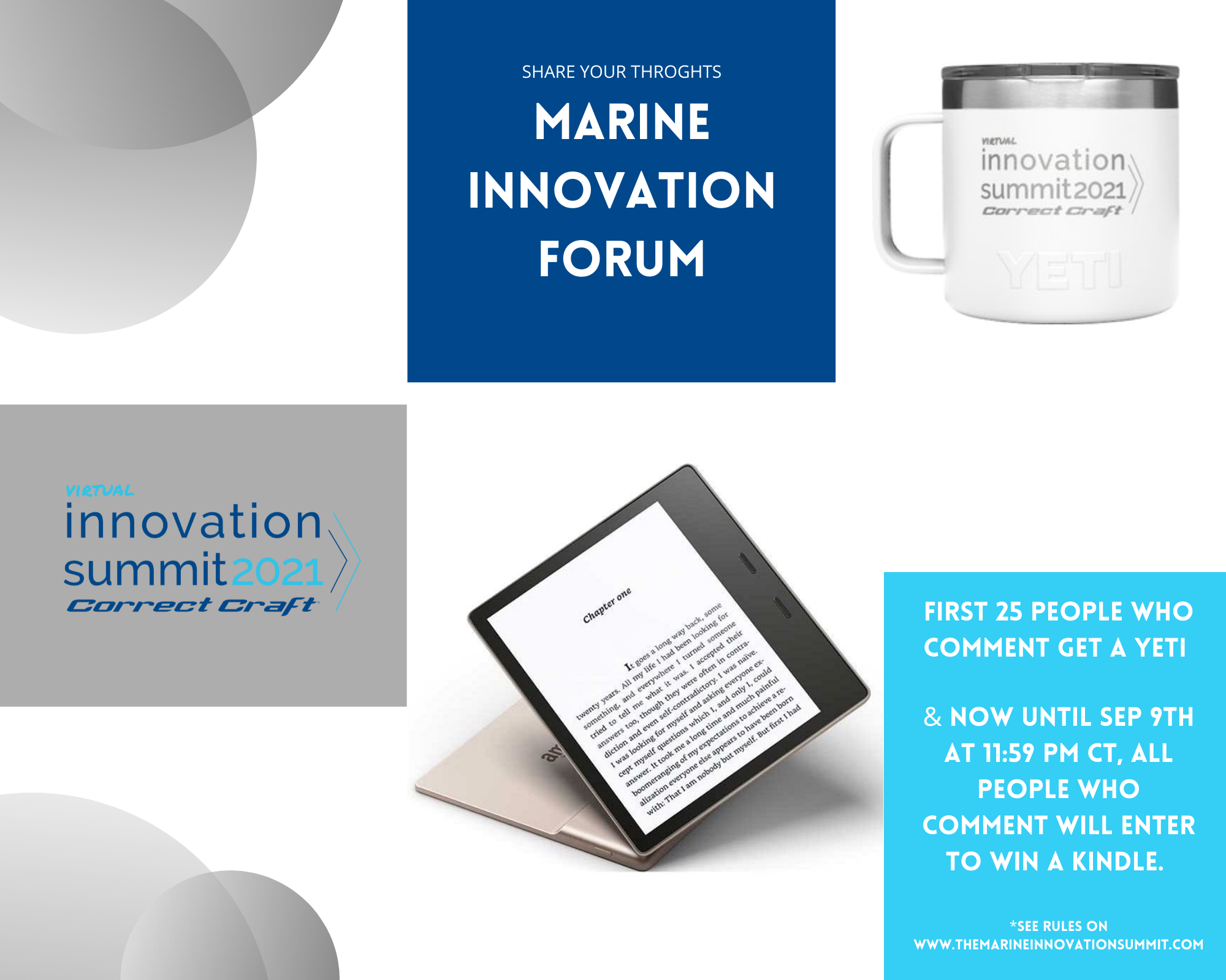 To enter this giveaway, you must register for the Innovation Summit and comment on its forum. The first 25 people to comment on the forum, under any question from its speakers, will win an Innovation Summit Yeti. We will consider all comments made from August 30th, 2021 at 8:00 AM CT to September 9th at 11:59 PM CT to enter a chance to win a Kindle. One person will be selected to win the Kindle by a random selection generator. A commentor can only be considered once. For example: one person cannot win all 25 Yetis by commenting 25 times. They will be understood as one winner. Winner names will be listed on the website and mailed their prize. The sponsor is Correct Craft located at 14700 Aerospace Parkway, Orlando, FL 32832.