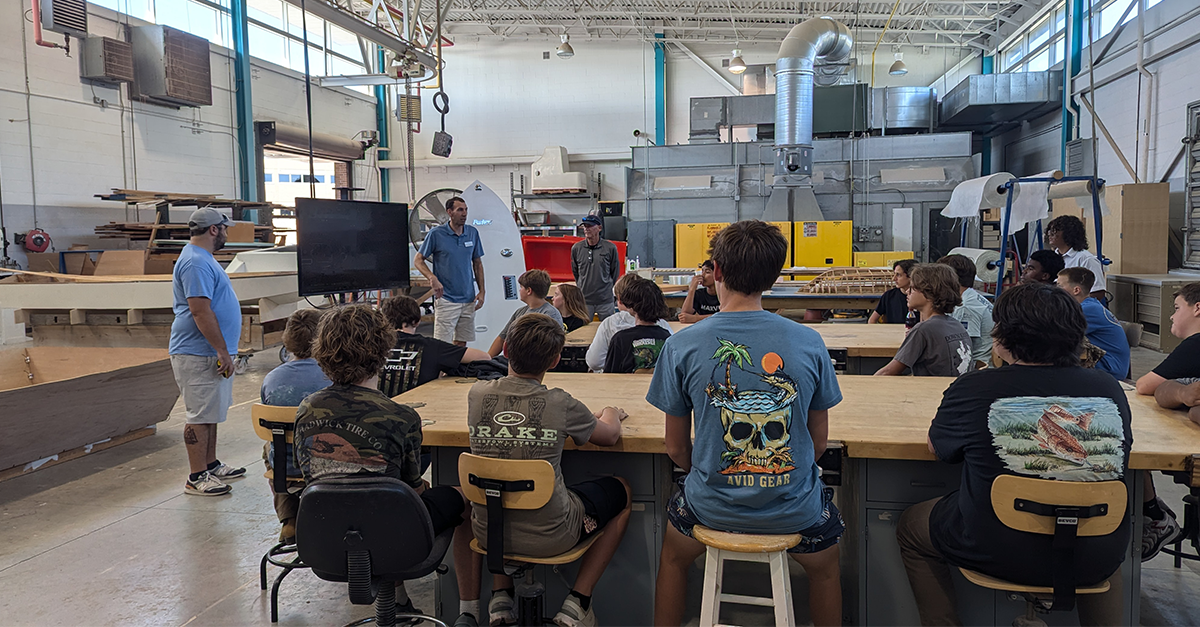 Middle school students from several Carteret County schools were invited to the Carteret County Community College boat-building facility to tour and learn about their current Boat Manufacturing and Service Technology program. Parker Offshore assisted in demonstrating how knowledge and skills learned in this program could translate into a future career.