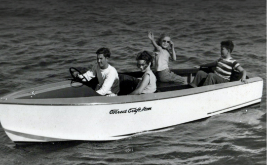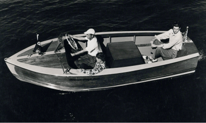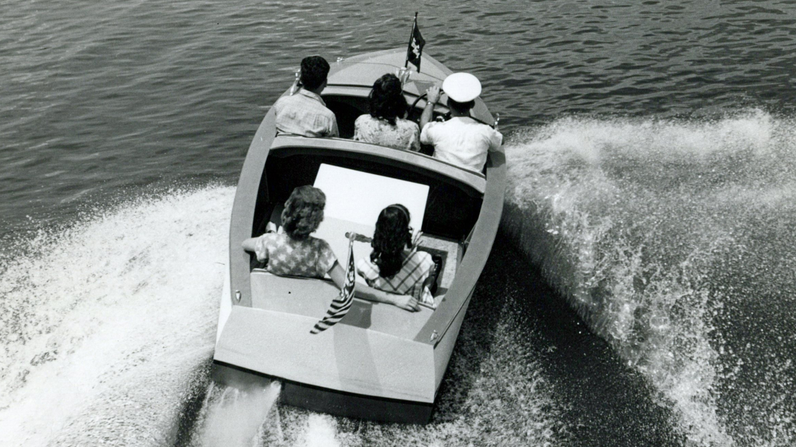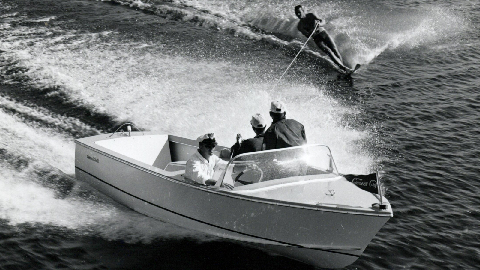 The 14′ Atom 25 plywood utility boat becomes one of the most sought after Correct Craft models and retails for $1,095.