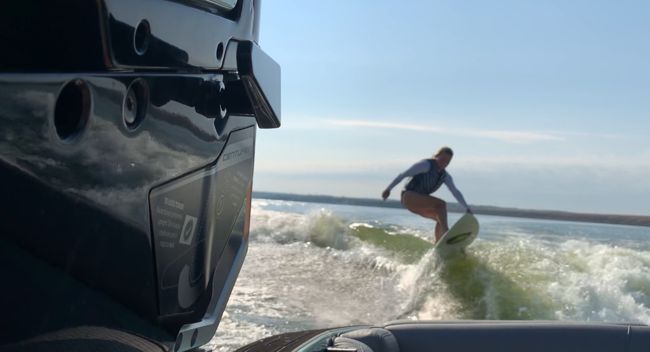 Despite a brief bout of soreness Holly was all in, she was hooked on a new sport. She bought a used wakeboard boat in 2016 and converted it into a surf boat. In 2017 her construction business found a new level of success and Holly found herself ready to invest in a new boat made specifically for wakesurfing. As she explored options, she kept finding that Centurion’s boats were made with wakesurfing in mind, the fuel efficiency was also an attractive benefit that Holly found unique to the Centurion brand.